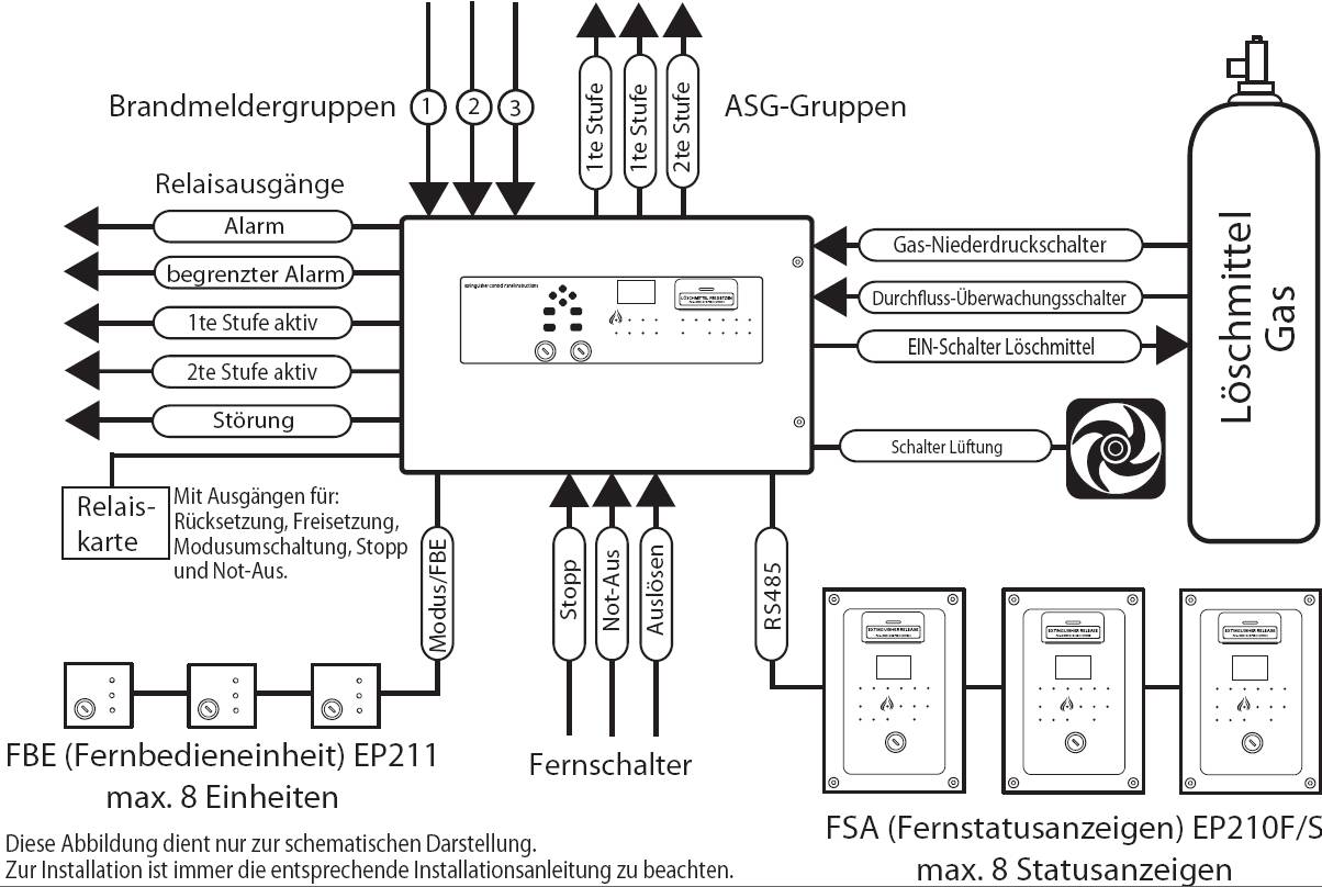 Jede Kombination aktiver Brandmeldergruppen kann so programmiert werden, dass die Löschmittelflutsequenz automatisch mit oder ohne Verzögerung gestartet wird. Und mit nicht weniger als sechs überwachte Eingänge, inklusive Halten und Abbruch, um die Flutsequenz jeder Zeit anzuhalten oder abzubrechen, steht die EP203 bereit, die populärste Löschsteuerzentrale am Markt zu werden, (siehe dazu auch schematische Darstellung weiter unten).